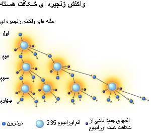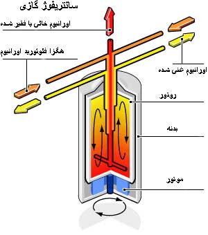 اورانيوم ۲۳۵ غنی شده ای که از اين طريق بدست می آيد سپس به داخل سانتريفوژ ديگری دميده ميشود تا درجه خلوص آن باز هم بالاتر رود. اين عمل بارها و بارها توسط سانتريفوژهای متعددی که بطور زنجيره ای به يکديگر متصل ميشوند تکرار ميشود تا جايی که اورانيوم ۲۳۵ با درصد خلوص مورد نياز بدست آيد. آنچه که پس از جدا سازی اورانيوم ۲۳۵ باقی می ماند به نام اورانيوم خالی يا فقير شده شناخته ميشود که اساسا از اورانيوم ۲۳۸ تشکيل يافته است. اورانيوم خالی فلز بسيار سنگينی است که اندکی خاصيت راديو اکتيويته دارد و از آن برای ساخت گلوله های توپ ضد زره پوش و اجزای برخی جنگ افزار های ديگر از جمله منعکس کننده نوترونی در بمب اتمی استفاده ميشود. يک شيوه ديگر غنی سازی روشی موسوم به ديفيوژن يا روش انتشاری است. در اين روش گاز هگزافلوئوريد اورانيوم به داخل ستونهايی که جدار آنها از اجسام متخلخل تشکيل شده دميده ميشود. سوراخهای موجود در جسم متخلخل بايد قدری از قطر مولکول هگزافلوئوريد اورانيوم بزرگتر باشد. در نتيجه اين کار مولکولهای سبکتر حاوی اورانيوم ۲۳۵ با سرعت بيشتری در اين ستونها منتشر شده و تفکيک ميشوند. اين روش غنی سازی نيز بايد مانند روش سانتريفوژ بارها و بارها تکرار شود. راکتور هسته ای: راکتور هسته ای وسيله ايست که در آن فرايند شکافت هسته ای بصورت کنترل شده انجام ميگيرد. انرژی حرارتی بدست آمده از اين طريق را می توان برای بخار کردن آب و به گردش درآوردن توربين های بخار ژنراتورهای الکتريکی مورد استفاده قرار داد. اورانيوم غنی شده، معمولا به صورت قرصهائی که سطح مقطعشان به اندازه يک سکه معمولی و ضخامتشان در حدود دو و نيم سانتيمتر است در راکتورها به مصرف ميرسند. اين قرصها روی هم قرار داده شده و ميله هايی را تشکيل ميدهند که به ميله سوخت موسوم است. ميله های سوخت سپس در بسته های چندتائی دسته بندی شده و تحت فشار و در محيطی عايقبندی شده نگهداری ميشوند. در بسياری از نيروگاهها برای جلوگيری از گرم شدن بسته های سوخت در داخل راکتور، اين بسته ها را داخل آب سرد فرو می برند. در نيروگاههای ديگر برای خنک نگه داشتن هسته راکتور ، يعنی جائی که فرايند شکافت هسته ای در آن رخ ميدهد ، از فلز مايع (سديم) يا گاز دی اکسيد کربن استفاده می شود.