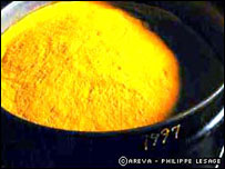 برای بدست آوردن بالاترين بازدهی در فرايند زنجيره ای شکافت هسته بايد از اورانيوم ۲۳۵ استفاده کرد که هسته آن به سادگی شکافته ميشود. هنگامی که اين نوع اورانيوم به اتمهای کوچکتر تجزيه ميشود علاوه بر آزاد شدن مقداری انرژی حرارتی دو يا سه نوترون جديد نيز رها ميشود که در صورت برخورد با اتمهای جديد اورانيوم بازهم انرژی حرارتی بيشتر و نوترونهای جديد آزاد ميشود. اما بدليل "نيمه عمر" کوتاه اورانيوم ۲۳۵ و فروپاشی سريع آن، اين ايزوتوپ در طبيعت بسيار نادر است بطوری که از هر ۱۰۰۰ اتم اورانيوم موجود در طبيعت تنها هفت اتم از نوع U۲۳۵ بوده و مابقی از نوع سنگينتر U۲۳۸ است. فراوری: سنگ معدن اورانيوم بعد از استخراج، در آسيابهائی خرد و به گردی نرم تبديل ميشود. گرد بدست آمده سپس در يک فرايند شيميائی به ماده جامد زرد رنگی تبديل ميشود که به کيک زرد موسوم است. کيک زرد دارای خاصيت راديو اکتيويته است و ۶۰ تا ۷۰ درصد آنرا اورانيوم تشکيل ميدهد. دانشمندان هسته ای برای دستيابی هرچه بيشتر به ايزوتوپ نادر U۲۳۵ که در توليد انرژی هسته ای نقشی کليدی دارد، از روشی موسوم به غنی سازی استفاده می کنند. برای اين کار، دانشمندان ابتدا کيک زرد را طی فرايندی شيميائی به ماده جامدی به نام هگزافلوئوريد اورانيوم تبديل ميکنند که بعد از حرارت داده شدن در دمای حدود ۶۴ درجه سانتيگراد به گاز تبديل ميشود.