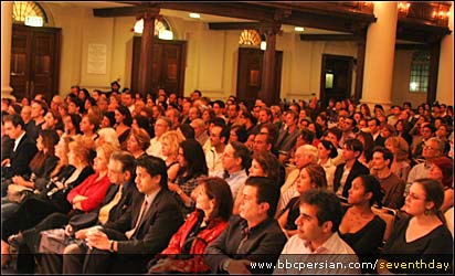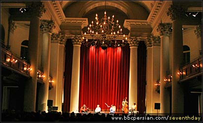 اون پایین داود و گروهش داشتن صدابرداری می کردن. صدا خوب نبود . صدای سه تار و" دابل بیس" هم کم بود. داود کلافه بود. صدای خودش رو روی صحنه با تاخیر می شنید. داود آزاد:"اینجوری تمام تحریرهام خراب می شه مثله تلفنه که صدا رو اکو می ده!" منوچهر حسین پورکه هم رفیق قدیمیم و از کسانیه که در تدارک کنسرت و تئاتر در ده سال گذشته کلی کار کرده و با ضرر و سختیش ساخته، مدیریت کنسرت را بعهده داشت، از فروش بلیتها راضی بود. بالاخره درها باز شد و مردم ریختن توسالن. منو به یاد جمعیت کنسرت بروی قدیما انداخت. زمانی که ایرانی ها تو لندن با لباس شب و کت و شلوار می رفتن کنسرت معین. تو این کنسرت تعداد خانمها زیادتر بود. موقع کنسرت می دیدم که بعضی از تماشاچیها درحالت خلصه رفتن و دارن سماع می کنن. حتی یه خانمی داد زد "هو". داود آزاد قبل و بعد از کنسرت