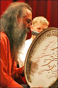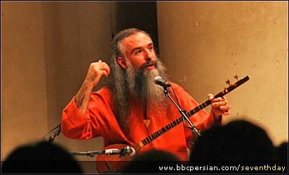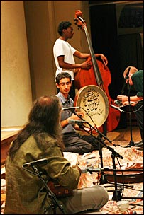 داود آزاد شب کنسرت رو فورم بود. با اینکه اعصابش سر صدا برداری خورد شده بود، یه لبخندی زد و گفت : وسط آنتراکت حرف می زنیم ، باشه؟ داود، چندین آلبوم بیرون داده که یکی از کارهای استثناییش "دیوان شمس و باخ" و آلبوم جدیدش که اسمش "در میخانه" است و شامل کارهای کنسرتیه که در تبریز داشته . کارهای این آلبوم الان در رادیو پیام ایران هم پخش می شه. اون شب کنسرت تار عالی ای زد ، تنبور محشر و سه تار که هم صداش ضعیف بود و هم اینکه گاهی به سبک تنبوری اجرا کردش که به قدرت دو ساز دیگه نبود. یک قسمت از کنسرت همنوازیه سازهای کوبه ای بود، که داود دف هم زد. وسط دو کنسرت رفتیم پائین تو رختکن، داود آزاد در حالی که داشت لباس عوض می کرد و بقیه ارکستر چیپس می خوردن و عکس می گرفتن با من حرف زد... "اشعاری از مولانا انتخاب کردم که بیشتر درباره شمس تبریزه. سازهای مختلفی که همنوازی می کردن در اصل گویای روحیه مولاناست که می گفت " اهل همه جا هستم و هیچ جا". متاسفانه صدا بردار اونشب خراب کرد و فقط صدای داود و صدای تبله هندی رو ضبط کرد وگرنه می تونستیم اینجا آهنگهای کنسرت رو با صدای خوب بشنویم!
