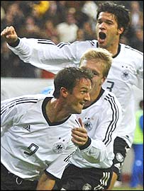 تيم ملی آلمان به عنوان اولين تيم گروه پنج بازيهای مقدماتی جام ملتهای اروپا به مرحله نهائی اين بازيها راه يافت. هر چند که آلمان بدون باخت به اين مرحله رسيد، ولی در آغاز اين بازيها با دو مساوی پی در پی در مقابل ليتوانی و اسکاتلند، و يک برد ضعيف(دو بر يک) در مقابل تيم جزاير فارو در چهار بازی اولش، هوادارانش را با نگرانی روبرو کرد. تيم ملی آلمان با 13 گل زده، 4 گل خورده و 18 امتياز از 8 بازی به عنوان تيم اول گروه پنج صعود کرد.