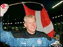 وقتی يوگسلاوی از شرکت در مرحله نهايی بازيها انصراف داد، اکثر بازيکنان دانمارک در تعطيلات بودند. يکی از جالب ترين داستانهای تاريخ فوتبال اينگونه آغاز شد و بازيکنان ريچارد مولر نيلسن تحت چنين شرايطی اولين قهرمانی در يک دوره مسابقه عمده بين المللی را بدست آوردند. يک مساوی در برابر انگلستان و يک برد غيرمنتظره در برابر سوئد، ميزبان مسابقات، کافی بود که اسباب صعود دانمارک از گروهش را فراهم سازد. بعد نوبت به هلند، مدافع عنوان قهرمان اروپا در آن زمان رسيد که دانمارک در يک بازی مهيج، کار را به ضربات پنالتی کشاند و آنجا بود که پيتر اشمايکل، دروازه بان افسانه ای دانمارک ضربه پنالتی مارکو ون باستن را مهار کرد تا دانمارک به فينال برسد. در اين مرحله به نظر می رسيد سرنوشت دانمارک اينطور رقم خورده که قهرمان مسابقات شود. همين طور هم شد و دانمارک آلمان را دو بر صفر شکست داد. شماره دو: مسابقات سال ۱۹۹۶ به ميزبانی انگلستان