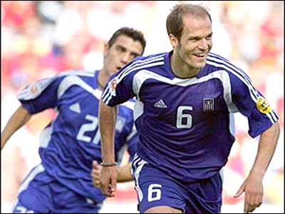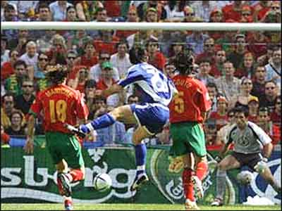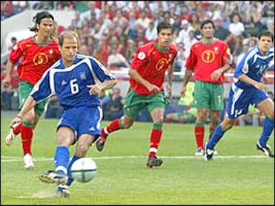 باسيناس مهاجم يونان، از روی نقطه پنالتی گل دوم يونان را وارددروازه پرتغال کرد