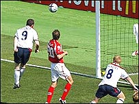 ديدار دو تيم انگلستان و سوئيس از گروه B جام ملتهای اروپا با گلهای وين رونی( دو گل) و استيون جرارد، سه بر صفر به سود انگلستان پايان يافت. دقيقه 82: (گل)نويل پس از دريافت توپ از بکهام وارد محوطه شش قدم سوئيس می شود و با يک پاس عرضی توپ را برای جرارد آماده می کند و جرارد گل سوم انگلستان را وارد دروازه سوئيس می کند. دقيقه 75:(گل) رونی توپی را که در محوطه جريمه سوئيس بدست آورده بود با ضربه ای سنگين به سوی دروازه شليک کرد که با تير افقی دروازه برخورد کرد و در برگشت به سر اشتيل، دروازه بان اصابت کرد و وارد دروازه شد. دقيقه 60: برنت هاس پس از دريافت کارت زرد دوم، از بازی اخراج شد. نيمه نخست ديدار دو تيم انگلستان و سوئيس از گروه B جام ملتهای اروپا با گل وين رونی يک بر صفر به سود انگلستان پايان يافت. دقيقه 23: چلسيتينی کارت زرد گرفت. دقيقه23(گل): بکهام توپ را درون محوطه جريمه سوئيس برای اوون سانتر می کند. اوون توپ را روی سر رونی می فرستد و رونی اولين گل انگلستان را به ثمر می رساند. وين رونی-18 ساله- جوان ترين بازيکنی است که در طول تاريخ جام ملتهای اروپا گل زده است. دقيقه 18: وين رونی به خاطر خطا روی اشتيل، دروازه بان سوئيس کارت زرد گرفت. ترکيب دو تيم بهترين خبر برای هواداران تيم ملی انگلستان، آمادگی پل اسکولز برای بازی مقابل سوئيس بود. تا ديروز مشخص نبود که آيا اسکولز که در ديدار مقابل فرانسه دچار پيچيدگی پا شد بتواند به بازی امروز برسد. در خط دفاع انگلستان هم جان تری پس از بهبود جايگزين لدلی کينگ شد. فابيو چليستينی که در بازی مقابل کرواسی در نيمه دوم به ميدان آمد، در بازی امروز از ابتدا در ترکيب اصلی سوئيس قرار گرفته است. انگلستان: جيمز، گری نويل، اشلی کول، کمپل، تری، جرارد، لمپارد، بکام، اسکولزف اوون، رونی سوئيس: اشتيل، هاس، مرات ياکين، مولر، اشپيخر، هوگل، چلستينی، ويکی، هاکان ياکين، فرای، شاپيوسا دو تيم سوئيس و انگلستان، در مجموع 22 بار مقابل هم قرار گرفتند که چهار بازی از سوی فدراسيون فوتبال انگلستان به رسميت شتانخته نشده است. اما از 18 بازی سهم انگلستان 11 برد و سهم سوئيس 3 برد بوده، و نتيجه 4 بازی به تساوی انجاميده است. |