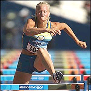 کارولينا کلافت قهرمان سوئدی طی مسابقه 100 متر با مانع از مسابقات هفتگانه دو و ميدانی