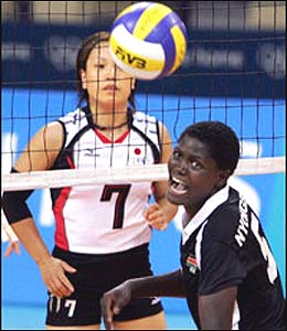 يوشی تاکشيتا (چپ) از ژاپن و نانسی نيونگسا (راست) از کنيا در مسابقه واليبال زنان