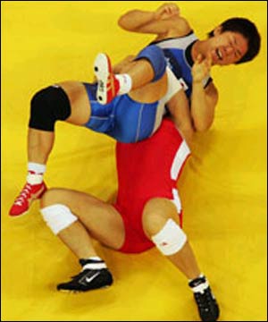 جدال ميان کوکو هاماگوچی( قرمز) دارنده پنج عنوان قهرمانی جهان و ژو وانگ از چين در رقابتهای کشتی زنان