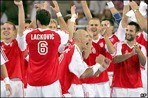 شادمانی بازيکنان تيم مای هندبال کرواسی پس از پيروزی شان در مقابل تيم ملی مجارستان در مرحله نيمه نهائی