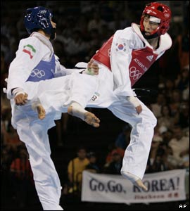 هادی ساعی (آبی) چپ در نيم نهائی مسابقات 68 کيلوگرم تکواندو به حريف کره ای خود چيره شد و به فينال اين وزن راه يافت- ساعی موفق شد در فينال حريف تايوانی اش را شکست دهد و دومين مدال طلای ايران را بدست آورد