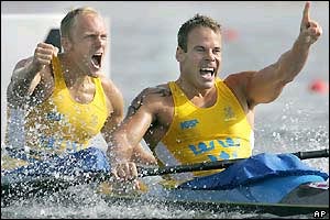 شادمانی تيم کاياک دو نفره سوئد در مسابقات 1000 متر پس از قهرمانی