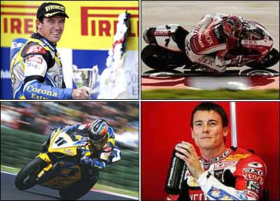 جيمز تاسلند بريتانيايی (راست) قهرمان مسابقات موتورسواری superbike سال 2004، نتوانست از قهرمانی خود دفاع کند و آن را به تروی کورسا (چپ) از استراليا با تيم سوزوکی واگذار کرد