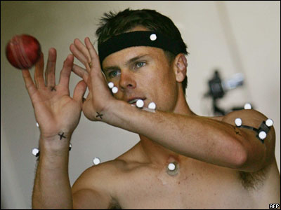 جان بوتا، کريکت باز آفريقای جنوبی در حال گرفتن توپ هنگام آزمايش حرکات بدن انسان در دانشکده علوم و تحقيقات حرکات نرمشی بدن انسان دانشگاه استراليای جنوبی در پرت