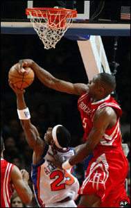 ديکمب موتومبو از تيم هوستون راکت، ضربه توپ حريف از تيم نيويورک نيکز در مسابقات بسکتبال NBA را مسدود کرد. اين مسابقه با نتيجه 89-93 در مديسون نيويورک به سود نيويورک نيکز پايان يافت.