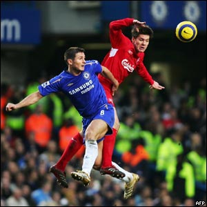 فرنک لمپارد (چلسی) و زابی آلونسو(ليورپول) در مسابقه فوتبال بين دو تيم چلسی و ليورپول، از سری مسابقات ليگ برتر انگلستان در روز يکشنبه در استامفورد بریج لندن، که با نتيجه 0-2، با ضربه های گل گالاس و کرسپو به سود چلسی به پايان رسيد.