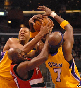 تلاش برای گرفتن توپ بين برايان کوک و لامار ادوم از لس آنجلس ليکرز با روبن پاترسون از پورتلند تريل بليزر در مسابقات بسکتبال حرفه ای آمريکا NBA که شب گذشته در لس آنجلس برگزار شد و با نتيجه 82-99 به سود ليکرز تمام شد.