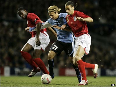جدال ريو فرديناند و لدلی کينگ از انگلستان با دياگو فورلان از اروگوئه در مسابقه دوستانه بين دو تيم. اين مسابقه که شب گذشته در استاديوم انفيلد ليورپول برگزار شد با نتيجه 1-2 به سود انگلستان تمام شد.