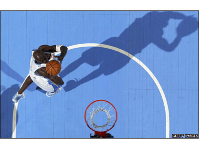 روبن پترسون از دنورناگتز توپ را به سمت حلقه ديترويت پيستونز هدايت می کند. مسابقه بين دو تيم از سری مسابقات NBA در کولورادو برگزار شد و دنورناگتز 87-98 پيستونز را شکست داد.
