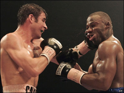 جو کالزاگ(چپ) بوکسور ولزی در مسابقات ميان وزن فدراسيون بوکس جهانی، جف لسی از آمريکا را ناک اوت و قهرمانی جهان را از آن خود کرد.