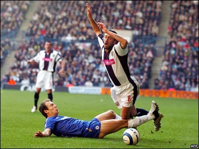 در مسابقات ليگ برتر انگلستان تيم چلسی با نتيجه 1-2 تيم وست برومويچ را در هاتورنز شکست داد. تصويری از تکل آرين روبن بازيکن چلسی بر جاناتان گرينينگ که باعث اخراج اين بازيکن شد.