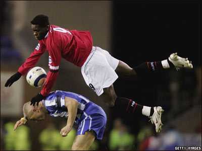 در مسابقات ليگ برتر انگلستان، تيم منچستر يونايتد با نتيجه 1-2 تيم ويگان را در استاديوم JJB ويگان شکست داد. تصويری از رقابت لوئی ساها از منچستر و گراهام کاواناگوف از ويگان.