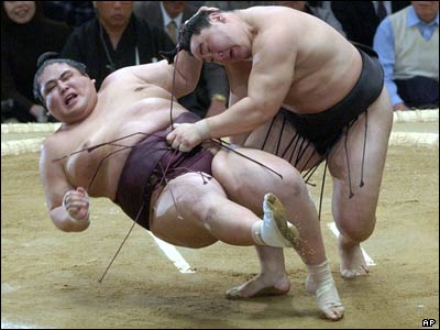 در اولين روز از دوره مسابقات 15 روزه کشتی سومو که در اوزاکا برگزار می شود، آساشوريو(راست) قهرمان فعلی اين مسابقات، بر ميابياما غلبه کرد.