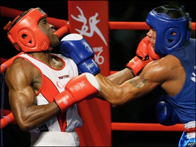 آدونيس استيونسون از کانادا و وارن فاواليلی از ساموآ در مسابقه بوکس ميان وزن 75 کيلوگرم