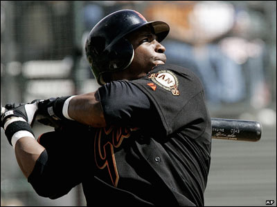بری باندز از سانفرانسيسکو جاينتز در مسابقه بيسبال بين اين تيم و لس آنجلس انجلز