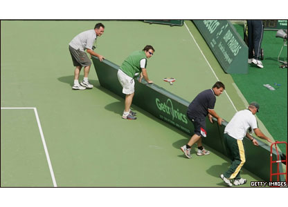 باد شديد در زمين تنيس کويانگ استراليا باعث حرکت دادن تابلوهای تبليغاتی کناره زمين شد. تمرينات در اين زمين برای آمادگی رقابتهای ديويس کاپ انجام می شود.
