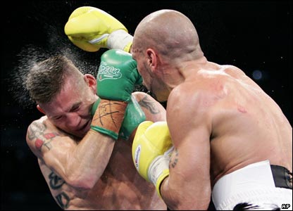 آنتونی ماندين (راست) از استراليا در مسابقات قهرمانی بوکس حرفه ای وزن 76 کيلوگرم، بر حريف خود دانی گرين غلبه کرد
