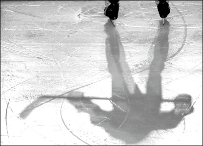 سايه ای از بازيکن تيم هاکی روی يخ اسلواکی در مسابقه بين اسلواکی و اوکراين