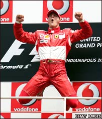 مايکل شوماخر(تيم فراری)، قهرمان هفت دوره از مسابقات جهانی فرمول يک، برای هشتاد و هفتمين بار مقام اول را در اين مسابقات به نام خود کرد. او اين پيروزی را در دهمين دوره از مسابقات فصل جديد در ايندياناپليس آمريکا بدست آورد.  |  مجموع امتيازات (گراندپری آمريکا) ۱- مايکل شوماخر(فراری)---------۱۰ امتياز ۲- فليپه مسا(فراری)-----------------۸ امتياز ۳- ژان کارلو فيسيکلا(رنو)----------۶ امتياز ۴-يارنو ترولی(تويوتا)---------------۵ امتياز ۵- فرناندو آلونسو(رنو)--------------۴ امتياز ۶- روبنز باريکلو(هوندا)-------------۳ امتياز ۷- ديويد کولتهارد(ردبول ريسينگ)---۲ امتياز ۸- وينتانتونيو ليوتزی(توروروسو)----۱ امتياز |
