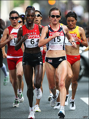 صحنه ای از رقابت دو ماراتن زنان. ریتا جپتو سیتیه نای دودنده اهل کنیا (شماره 6) و مارا یاماوچی از بریتانیا (شماره 15) در جلوی صف دیده می شوند.