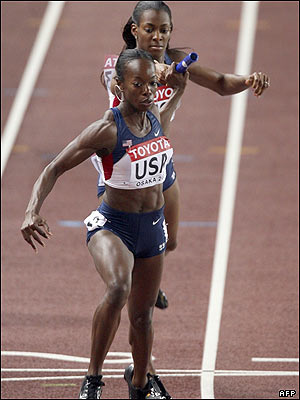 مونیک هناگان ( نفر پشتی) باتوم را به مری واینزبرگ می دهد. تصویر مربوط به دور مقدماتی دو چهار در چهارصد متر امدادی است |