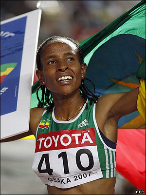 مسرت دفار، دونده اهل اتیوپی پیروزی خود را در رقابت های پنج هزار متر جشن می گیرد. پس از دفار دوندگان کنیایی دوم و سوم شدند.