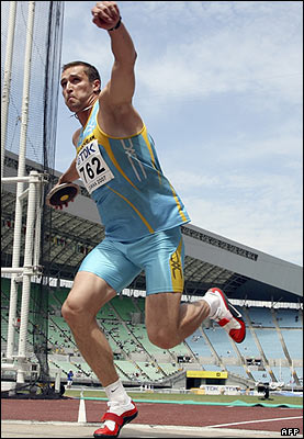 دیمیتری کارپوف، ورزشکار اهل قزاقستان در یکی از بخش های مسابقه دهگانه دیسک را پرتاب می کند