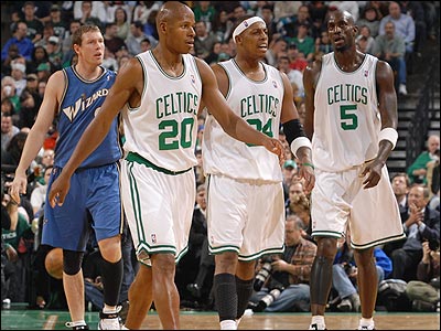 (از راست) کوین گارنت، پال پیرس و ری آلن، سه ستاره بوستون، این تیم را متحول کرده اند. بوستون به حریفان خود (بطور متوسط) اجازه کسب بیش از 90.9 امتیاز را نداده است و بهترین تیم ان بی ای از نظر دفاع محسوب می شود. در حمله هرچند از جمع پانزده تیم برتر لیگ خارج هستند اما پیروزی در برابر تورنتو با شوت ثانیه آخر ری آلن نشان داد که کسب امتیاز بیشتر لزوما به معنی قدرتمندتر بودن نیست.