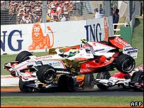 ژان کارلو فیسیکلا، راننده ایتالیایی تیم فورس ایندیا، اولین راننده ناکام بود که یک برخورد باعث پرتاب شدن اتومبیل او به هوا و خارج شدن اتومبیل او از دور شد. سباستین وتل، راننده کم سن و سال تیم تورو روسو، که مهارت او در روز زمانگیری باعث تحسین همگان شده بود، در استارت ناموفق بود و پس از برخورد اتومبیلی از پشت با او، اتومبیل جنسون باتن، راننده هوندا را از دور خارج کرد. مارک وبر، راننده استرالیایی ردبول هم در برخورد با آنتونی دیویدسون از مسابقه بیرون رفت. در همین بین، فیلیپه مسا، راننده فراری که در تلاش بود از هایکی کوالاینن برای کسب مکان سوم سبقت بگیرد، بخاطر دادن گاز بیش از حد در هنگام خروج از پیچ یک، چرخید و با برخورد به دیواره های محافظ حاشیه پیست، مجبور به بازگشت به گاراژ و تعویض کل دماغه اتومبیل خود شد. این حوادث به اولین حضور اتومبیل ایمنی در پیست منجر شد. قهرمانی پر اشتباه، روزی سیاه برای فراری
