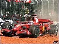تعویض باله جلو سپس سوختگیری فیلیپه مسا باعث شد این راننده در انتهای قطار رانندگان قرار گیرد، اما در میانه مسابقه و در شرایطی که او خود را چند مکان بالاتر کشیده بود، تصادف او در هنگام سبقت در پیچ اول از دیوید کولتهارد، راننده ردبول، باعث آسیب دیدگی شدید اتومبیل کولتهارد و کناره گیری او از مسابقه شد. فیلیپه مسا هم کمتر از چهار دور بعد از این حادثه بعلت نقص فنی مجبور به خروج از مسابقه شد. کیمی رایکونن، قهرمان فصل گذشته مسابقات، که مسابقه را از مکان پانزدهم آغاز کرده بود، در دور اول خود را به مکان هشتم رساند، اما پس از آن برای رسیدن به مقام هفتم، به مدت 17 دور پشت سر روبنز باریکلو، راننده هوندا ماند.
