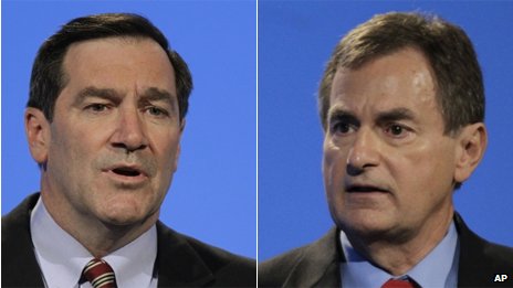 تیم کین، در سمت چپ، و جورج الن، هر دو پیش از این فرماندار ایالت ویرجینیا بودهاند