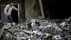 یک فلسطینی که زخمی شده است، سعی دارد از ویرانه خانهاش بیرون بیاید. خانه این مرد در جریان حمله هوایی امروز صبح اسرائیل تخریب شد
