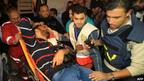 یکی از خبرنگاران زخمی فلسطینی در حال انتقال به بیمارستان شفا در غزه. این خبرنگار در حمله امروز صبح اسرائیل به ساختمان محل استقرار چند رسانه محلی در غزه زخمی شد