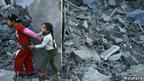 دو دختر فلسطینی در ویرانههای یک خانه پس از حمله اسرائیل به غزه