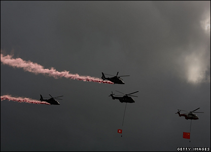 هلی کوپترهای چینی، پرچمهای هنگ کنگ و چین را بر فراز محل برگزلاری جشنهای دهمین سالگرد به نمایش گذاشته اند.