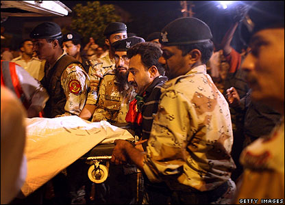 پیکر بی نظیر بوتو، نخست وزیر سابق پاکستان، که روز پنجشنبه ترور شد از بیمارستان راولپندی در یک تابوت ساده چوبی حمل می شود.