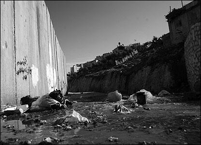 در آن سوی ديوار، جایی که جزو شهرداری بیت المقدس است، اردوگاه پناهندگان فلسطینی است. ساکنان اين اردوگاه که شوفات نام دارد به دولت اسرائیل مالیات می پردازند ولی اجازه ورود به بیت المقدس را ندارند. وضعيت زندگی در اردوگاه اسف بار است. در اين تصویر خندقی که پای دیوار قرار دارد به محل جمع شدن فاضلاب و زباله تبدیل شده است.