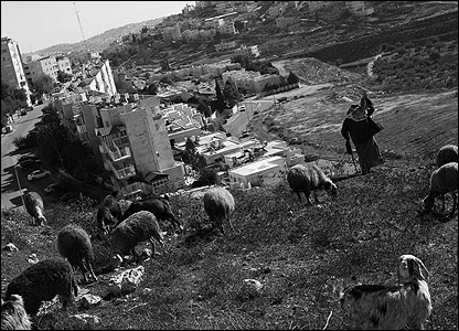 محله های یهودی نشین و فلسطینی نشین در نزديکی هم قرار دارند. اما ساکنان آن به ندرت باهم در تعاملند. تصویری از چوپانی فلسطینی در حال چراندن گوسفندانش در فاصله ای بین شهرکی یهودی نشین و روستایی فلسطینی. طبق قوانين بین المللی شهرکهایی که دولت اسرائیل در مناطق اشغالی ساخته غیر قانونی است. حدود30 درصد از اين منطقه شهرک سازی شده که بیش از 200 هزار یهودی در آن سکونت دارند.