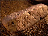![]() Esta barra esculpida, usada para pigmentação, foi encontrada na caverna e tem 77 mil anos |