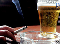 Fumar um cigarro enquanto se consome uma bebida alcoólica pode reduzir os efeitos de embriaguez, sugerem cientistas do Estado americano do Texas. A pesquisa, contudo, foi feita apenas em ratos de laboratório, que receberam diversas doses de nicotina e bebida alcoólica. Os pesquisadores acreditam que os níveis mais baixos de álcool encontrados em ratos "fumantes" são explicados pela forma como ele é absorvido no sangue. Mas, se o mesmo se aplicar aos seres humanos, os pesquisadores advertem que os fumantes provavelmente tenderão a beber mais para compensar a diminuição dos efeitos do consumo de álcool. Em artigo publicado em Alcoholism: Clinical and Experimental Research, os cientistas expõem a sua teoria para explicar porque o nível de álcool no sangue dos ratos diminuiu na medida em que o de nicotina aumentou. Eles acreditam que a nicotina atrasa a passagem do álcool pelos intestinos - um importante local para a sua absorção. Enquanto são retidas no estômago, as moléculas de álcool são metabolizadas, deixando menos delas para passarem do estômago para o intestino, e, assim, para o sangue. | NOTÍCIAS RELACIONADAS Benefício de álcool é só para homens, diz estudo26 de maio, 2006 | Ciência & Saúde Escócia começa a banir o fumo em locais públicos 26 de março, 2006 | Ciência & Saúde Califórnia classifica fumaça de cigarro como poluição27 de janeiro, 2006 | Ciência & Saúde Estudo diz que risco é alto mesmo para quem fuma pouco22 de setembro, 2005 | Ciência & Saúde | ||||||||||||||||||||||||||||||||||||||||||||||||||||||||||||||||||||||||||||||||||||||||||||||||||||||||||||||||