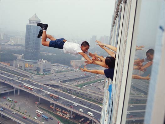Um artista chinês está expondo em diversos países do mundo fotos onde aparenta desafiar a gravidade, caindo de prédios e janelas.