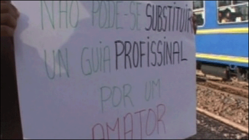 Cerca de 200 guias turísticos de Machu Pichu, no Peru, protestaram contra uma proposta de lei para permitir que agricultores locais também trabalhem como guias.